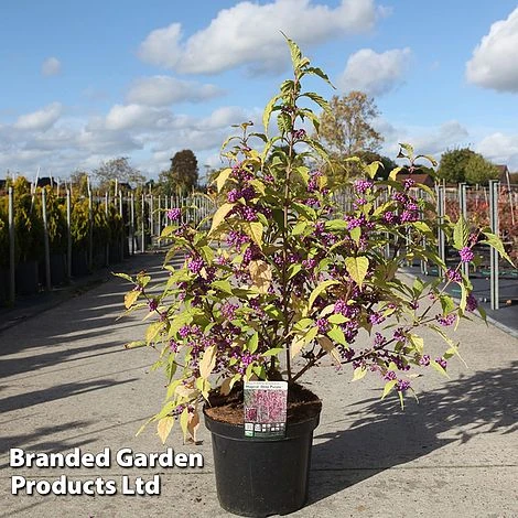Callicarpa bodinieri ‘Magical Deep Purple’ features not only beautiful, dark purple berries, but dark purple stems too, which provide an additional autumn feature.