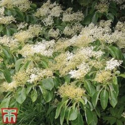 A rounded, deciduous tree bearing spreading tiered branches. Elliptic 15cm (6″) leaves are glossy, dark green above and glaucous beneath and turn a rich red-purple during the autumn. Fragrant, small, white star shaped flowers are produced in large cymes to 18cm (7’’) across during May and June. Spherical blue/black berries appear in autumn. An outstanding specimen tree for a larger garden as it does need space. Does best in fertile, humus rich, well drained neutral to acid soil in sun or partial shade. Fully hardy. Height: 15m (50’). Spread: 15m (50’).