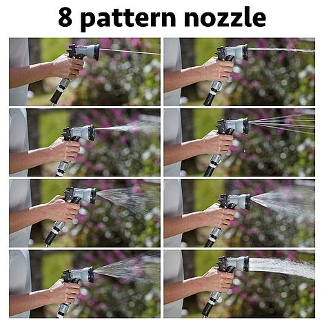 The hose comes with an eight-pattern, hand-held spray nozzle which allows you to choose from full, jet, vertical, shower, soaker, cone, flat and mist options. It also has a trigger lock feature, allowing the spray nozzle to be locked into place so the user doesn’t have to manually hold the trigger down.