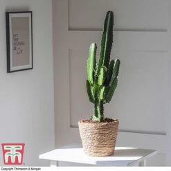 Euphorbia acrurensis makes a superb architectural feature in your home. Although it has a cactus-like appearance, this plant is actually a succulent, reaching tree-like proportions in its native African homelands! Don’t be alarmed – in your home, it will be restricted by its pot and remain a perfectly manageable size. The upright stems form a candelabra effect with a clean, contemporary feel that particularly suits modern interiors. Better still, it will suit your busy modern lifestyle too – this columnar house plant needs virtually no maintenance at all. This intriguing succulent is perfect for a sunny or lightly shaded windowsill or grown as a specimen plant in a frost free conservatory. Height: 120cm (48″). Spread: 60cm (24″).