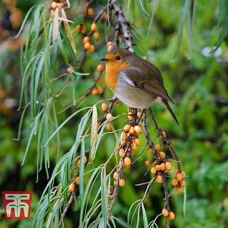 A female cultivar of the Sea Buckthorn, Hippophae rhamnoides ‘Leikora’ produces masses of orange berries in autumn which stand out magnificently against the silvery green foliage. This shrub grows well in adverse conditions, preferring dry almost sandy soils, where it will thrive. The grape sized fruits of this hardy deciduous shrub are a rich source of Vitamin C but will require a male plant to produce the best crops. An ideal plant to grow as hedging or screening, Hippophae is also well suited for coastal gardens. Height: 8m (26′). Spread 8m (26′).