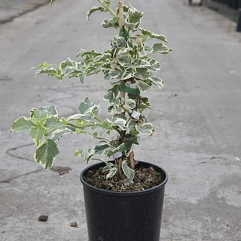 A variegated version of the climbing hydrangea that is useful for illuminating shady areas, Hydrangea anomalas petiolaris ‘Silver Lining’ bears foliage splashed silver, white and green. This self-clinging, deciduous climber bears masses of large, white, lace-cap type flowers from the ends of stems in midsummer. Excellent for a north or east-facing situation, it grows vigorously once established. Height: 15m (49ft). Spread: 3m (10ft).