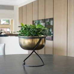 Introduce a distinctive twist to your living room décor with our indoor Kensington metal planter. Waterproof for practical plant health, this brass-finish accent piece on a modern twisted stand is perfect for spotlighting your favourite Chinese evergreen plant, but looks just as wonderful when styled alone.