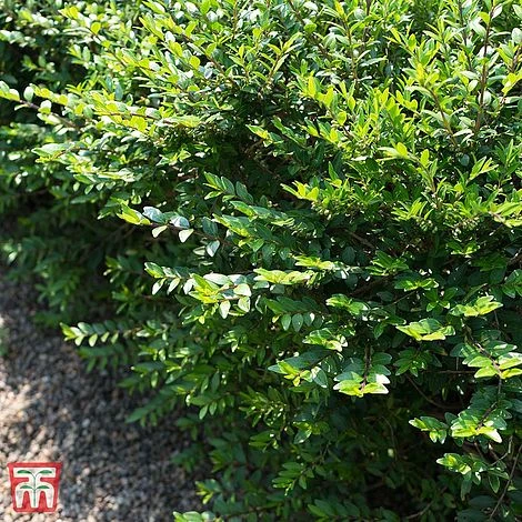 You can dodge the problems with box blight by choosing the Box-leaved Honeysuckle instead of traditional Box. Lonicera pileata plants are tough, quick-growing and drought resistant. Box-leaved Honeysuckle is a low, spreading, evergreen shrub with glossy leaves. The display is enhanced by creamy spring flowers and purple autumn berries. Excellent for low maintenance, compact hedging, plants are fast-growing and easy to trim in summer and autumn. Height: 1m (39″). Spread: 2.5m (8′).