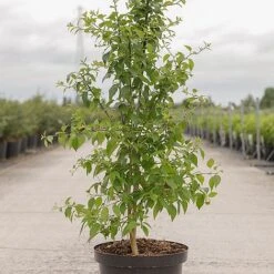 Maclura pomifera develops a wide, spreading crown of thorny branches clothed in ovate, dark green leaves. In autumn, it features bright yellow autumn foliage colour accompanied by fragrant, tennis-ball-sized fruits with warty skin. The fruits are inedible but provide an ornamental display, changing from green when young to yellow/orange as they age. Maclura pomifera is a unique specimen tree for a medium to large garden. Drought tolerant when established, it suits freely-draining soils and tolerates shallow chalk.