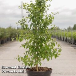 Maclura pomifera develops a wide, spreading crown of thorny branches clothed in ovate, dark green leaves. In autumn, it features bright yellow autumn foliage colour accompanied by fragrant, tennis-ball-sized fruits with warty skin. The fruits are inedible but provide an ornamental display, changing from green when young to yellow/orange as they age. Maclura pomifera is a unique specimen tree for a medium to large garden. Drought tolerant when established, it suits freely-draining soils and tolerates shallow chalk.