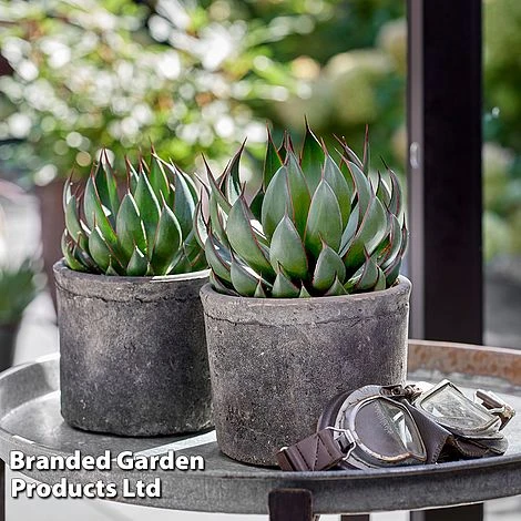 Boasting the architectural qualities of an Agave, but much faster growing, Mangave ‘Blazing Saddles’ makes a striking succulent specimen for a conservatory or patio pot. This indoor/outdoor plant represents a revolution in plant breeding. Mangave is a hybrid cross between an Agave and Manfreda, hardier than an Agave, faster-growing, lacking those vicious spikes and with a fuller, tighter rosette like an Echeveria. Drought tolerant, it will require little watering and can be grown outside all year in areas with very mild winters such as coastal and city gardens, but like most tender perennials, will otherwise need to be brought into a frost-free greenhouse or conservatory over winter. Use it as a striking focal specimen on its own or combine it with other succulents and tropical bedding for a really wow-factor display. Height: 20cm (8in). Spread: 35cm (14in).