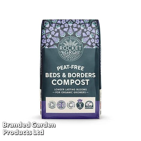 A nutrient rich, 100% organic, chemical-free and peat-free all-round plant and shrub compost for organic growers. RocketGro Peat Free Beds and Borders compost is a superior blend of professional quality compost which will boost soil health, root growth and strengthen your plants and shrubs. Ready to plant straight in to, it naturally feeds your young and mature plants with essential micro-nutrients and N:P:K. for 3 months.