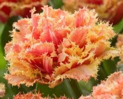 Beautiful and long-lasting, Tulip ‘Brisbane’ will delight you when in full flower—the richness of the blooms bring to mind the lusciousness of peonies. Tulip ‘Brisbane’ is a fabulous compact, double flowering variety, producing stunning orange, peach, pink and light yellow, cup-shaped, ruffled flowers. Each petal has a finely fringed edge. The leaves are broad, lance-shaped and a beautiful blue-green. Relatively new, and rarely seen for sale, it is a tulip to savour.